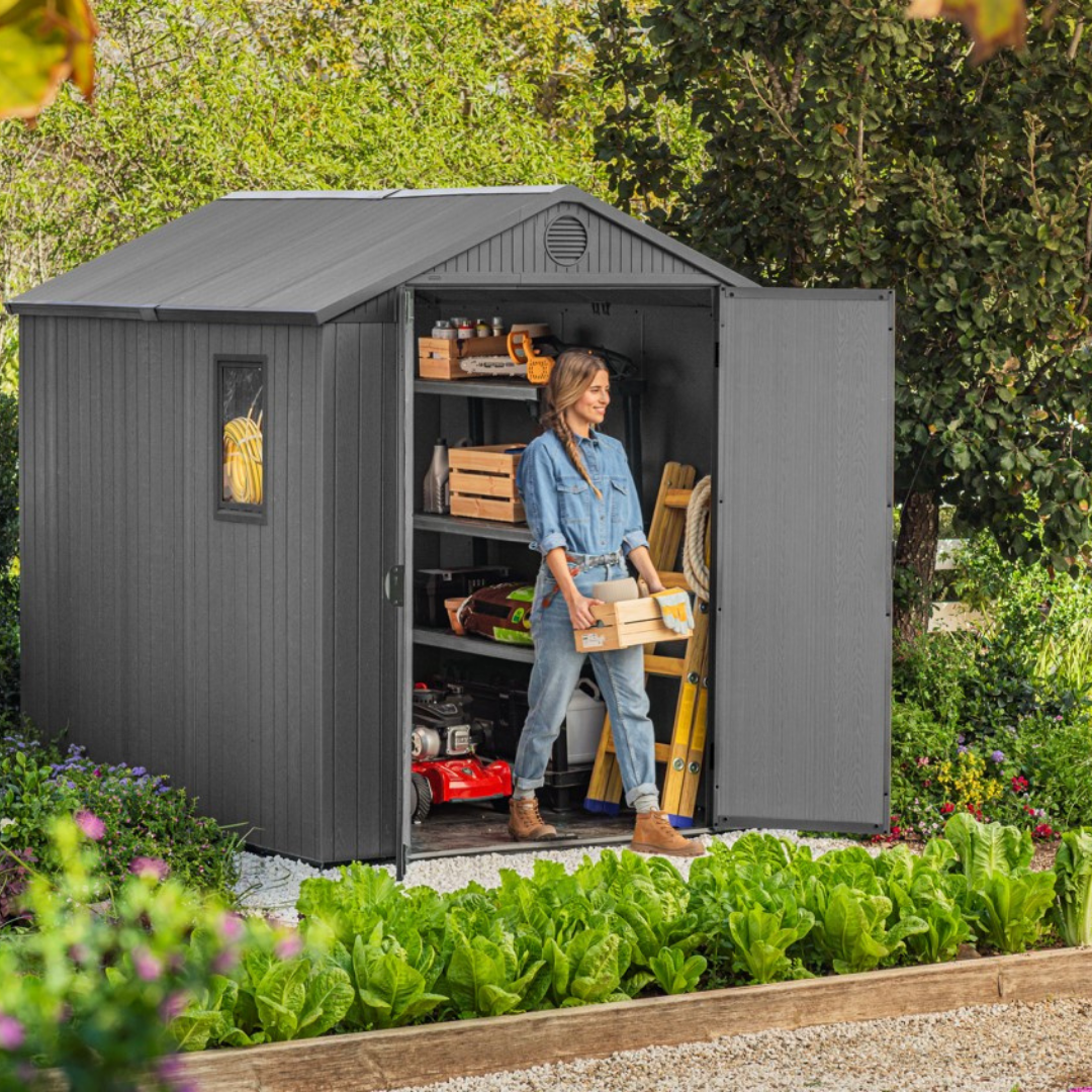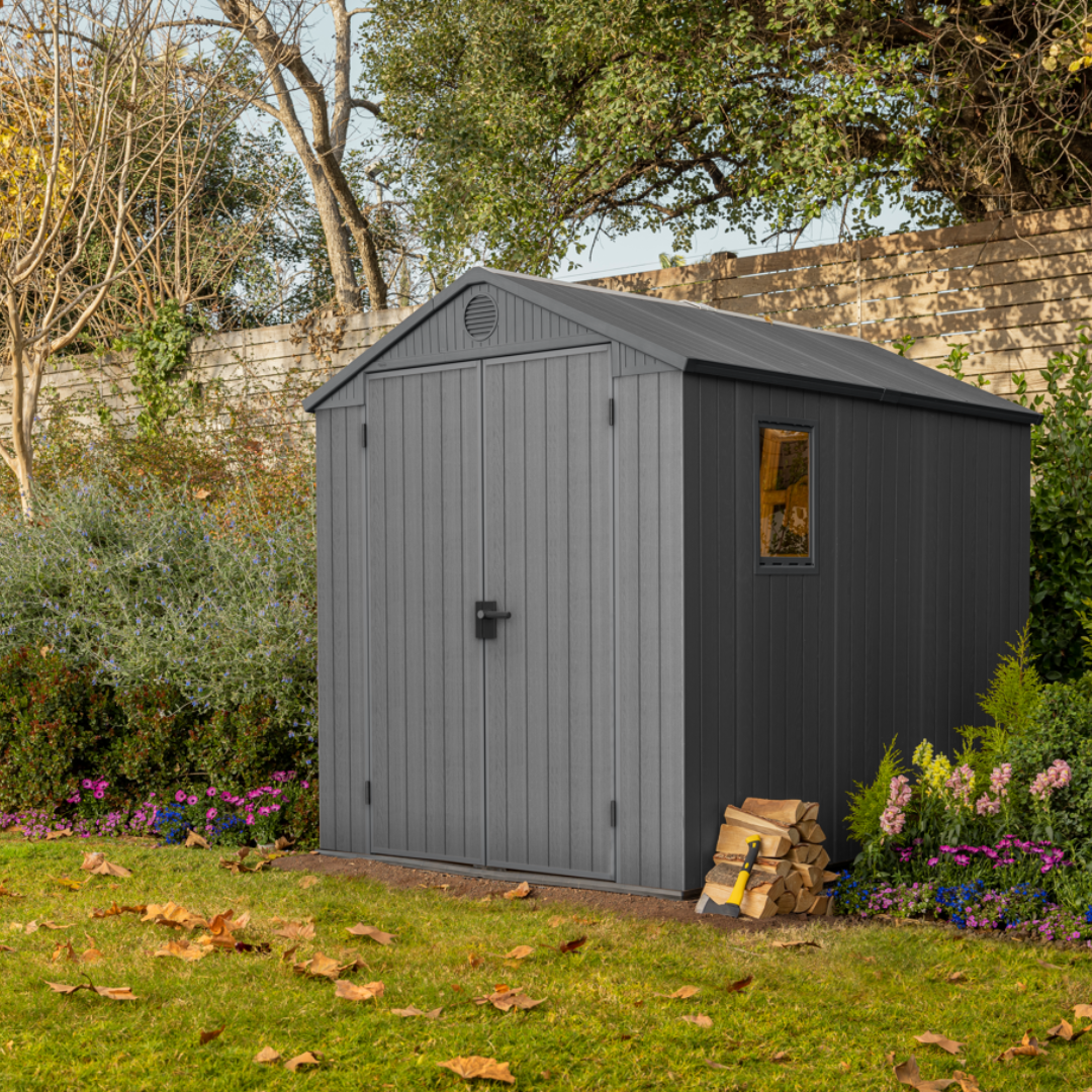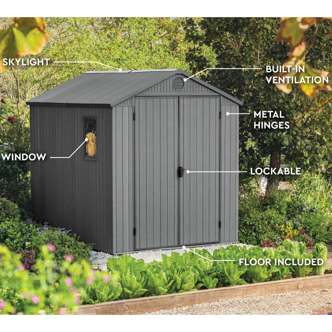 • super easy to assemble with tongue & groove panels Everyday sustainability: contains recycled materials (30%) 10 year limited warranty Evotech composite material feels and looks like wood 16mm double walls for greater strength and rigidity lockable (own padlock required) built-in ventilation fixed window and full-length skylight for natural light (choice of positioning when assembling) included floor panel protects contents from mud and water attractive wood-look design in grey dimensions: external: 190Wx244Dx221H cm internal: 176Wx234.5Dx212H cm Freestanding shelves and compatible accessories available here view assembly instructions