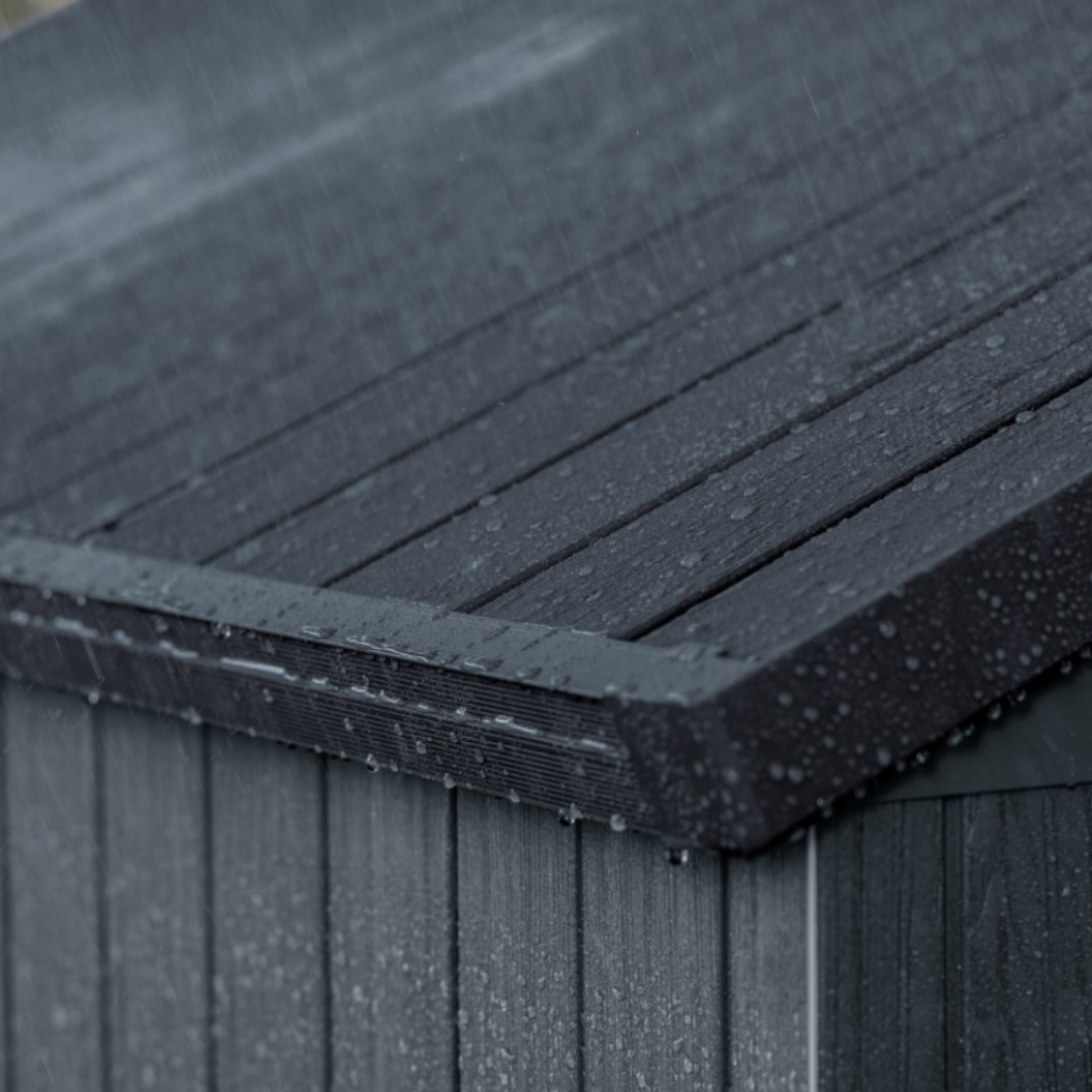 super easy to assemble with tongue & groove panels Everyday sustainability: contains recycled materials (30%) 10 year limited warranty Evotech composite material feels and looks like wood 16mm double walls for greater strength and rigidity lockable (own padlock required) built-in ventilation fixed window and full-length skylight for natural light (choice of positioning when assembling) included floor panel protects contents from mud and water attractive wood-look design in grey dimensions: external: 190Wx244Dx221H cm internal: 176Wx234.5Dx212H cm Freestanding shelves and compatible accessories available here view assembly instructions