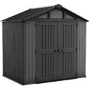 - online exclusive elegant aesthetics blend with strength and durability in a spacious design Evotech+ resin composite material feels and looks like wood spacious interior extra wide double door opening (154 W x 185cm H) great for storing heavy equipment, ride on lawn mowers, bicycles and motorbikes 19mm double wall construction for greater strength and rigidity lockable with 3-point locking system (own padlock required) ergonomic door handle for one-hand opening built-in ventilation 3D roof tiles steel reinforced roof heavy duty powder coated metal hinges full length skylight and XL transom windows for plenty of natural light included heavy duty floor panel can support ride-on mower and protects contents from mud and water attractive wood-look design in grey external dimensions: 252 x 175 x 241cm (W x D x H) internal dimensions: 240 x 160 x 235.5cm (W x D x H) door opening: 152.5 x 183.5cm (W x H) assembly required freestanding shelves and compatible accessories available here 10 year limited warranty
