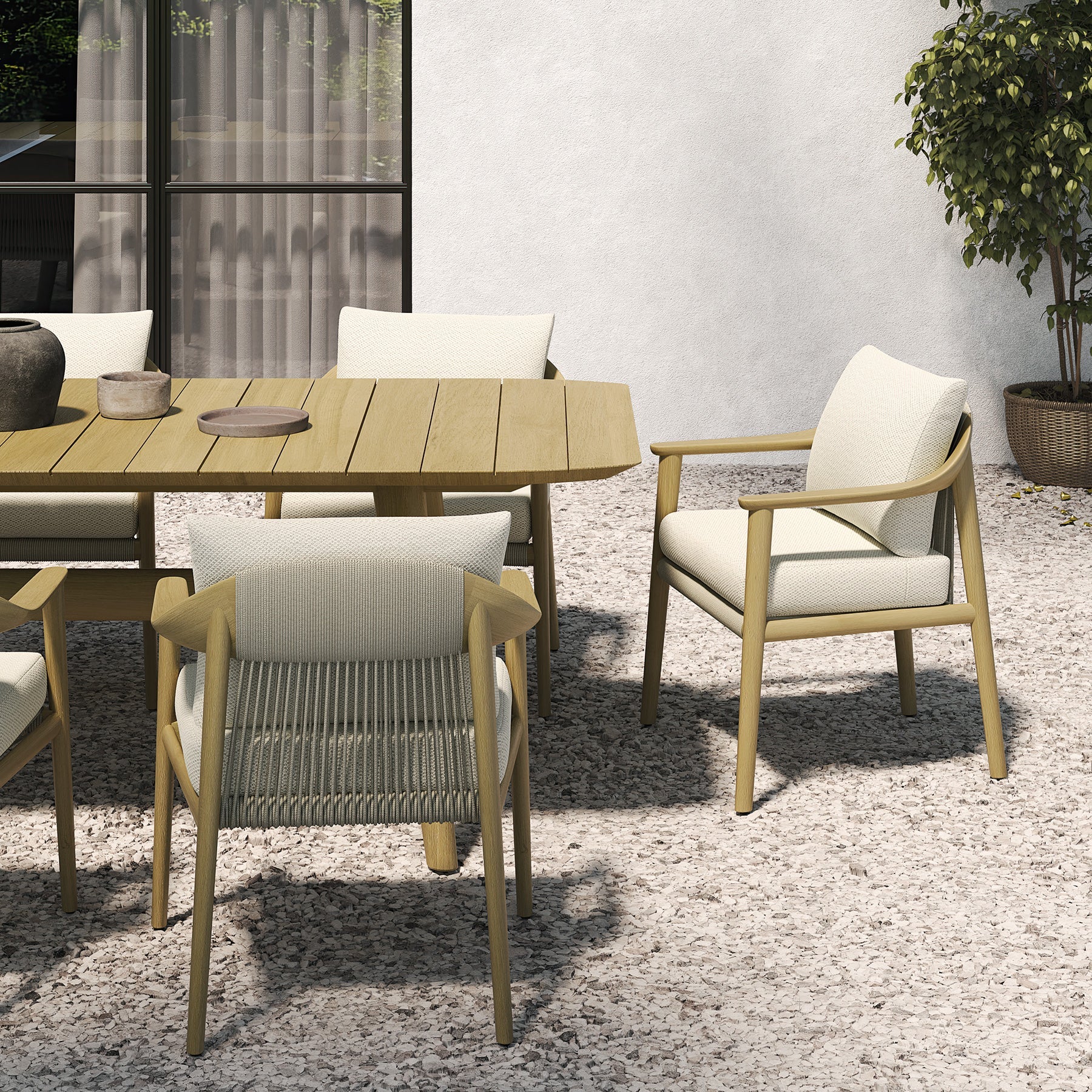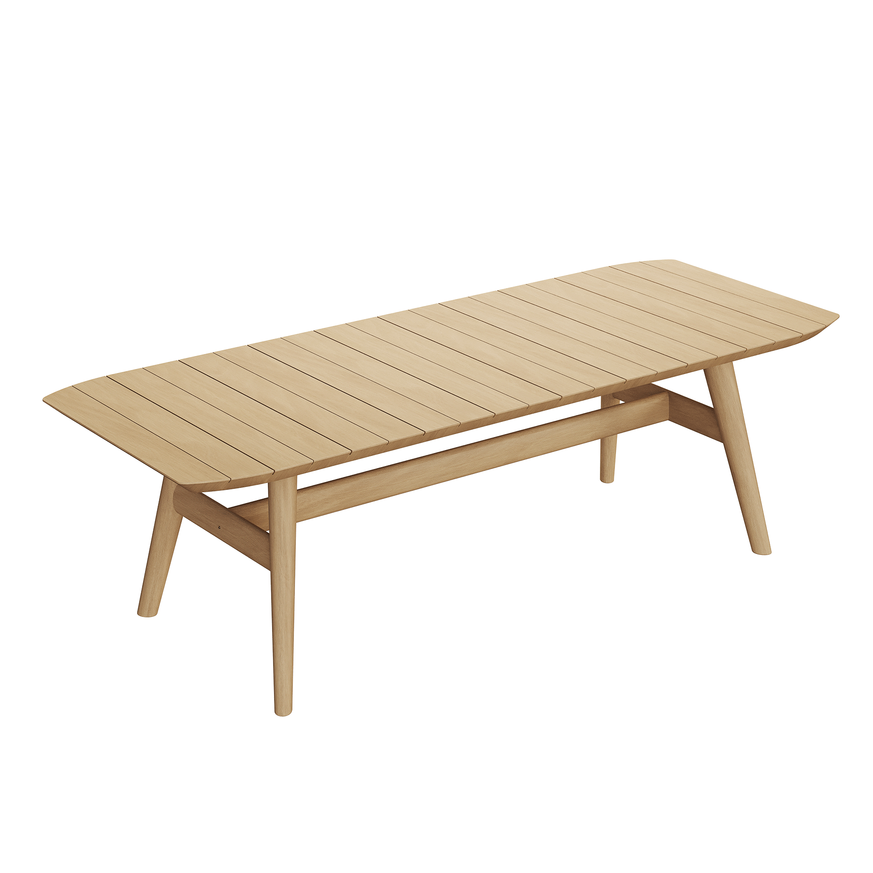 The table’s silhouette is harmonious of form and function, its sleek and angular legs supporting a surface that is both expansive and welcoming. The slatted top, reminiscent of classic style, allows for a play of light and air, adding an element of tactile pleasure to the visual grace. Each gathering at this table promises to be bathed in the warmth of natural wood, set against the backdrop of the open air, making it an ideal stage for memorable alfresco dining experiences.