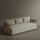 The N4 Three Seater Sofa boasts a warm, natural finish that highlights the rich, golden tones of the teak. The teak frame features vertical slats encasing the sofa, creating an open and airy feel that enhances the chair’s overall aesthetic. The design language of this piece features clean lines and an open frame structure to allow light and air to flow freely, contributing to a sense of spaciousness.
