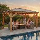 The Yardistry Meridian Gazebo provides an outdoor living space. It features a durable aluminum roof and sturdy 6 in x 6 in posts. Constructed from 100% cedar lumber with a natural cedar stain finish. Assembly instructions are included.